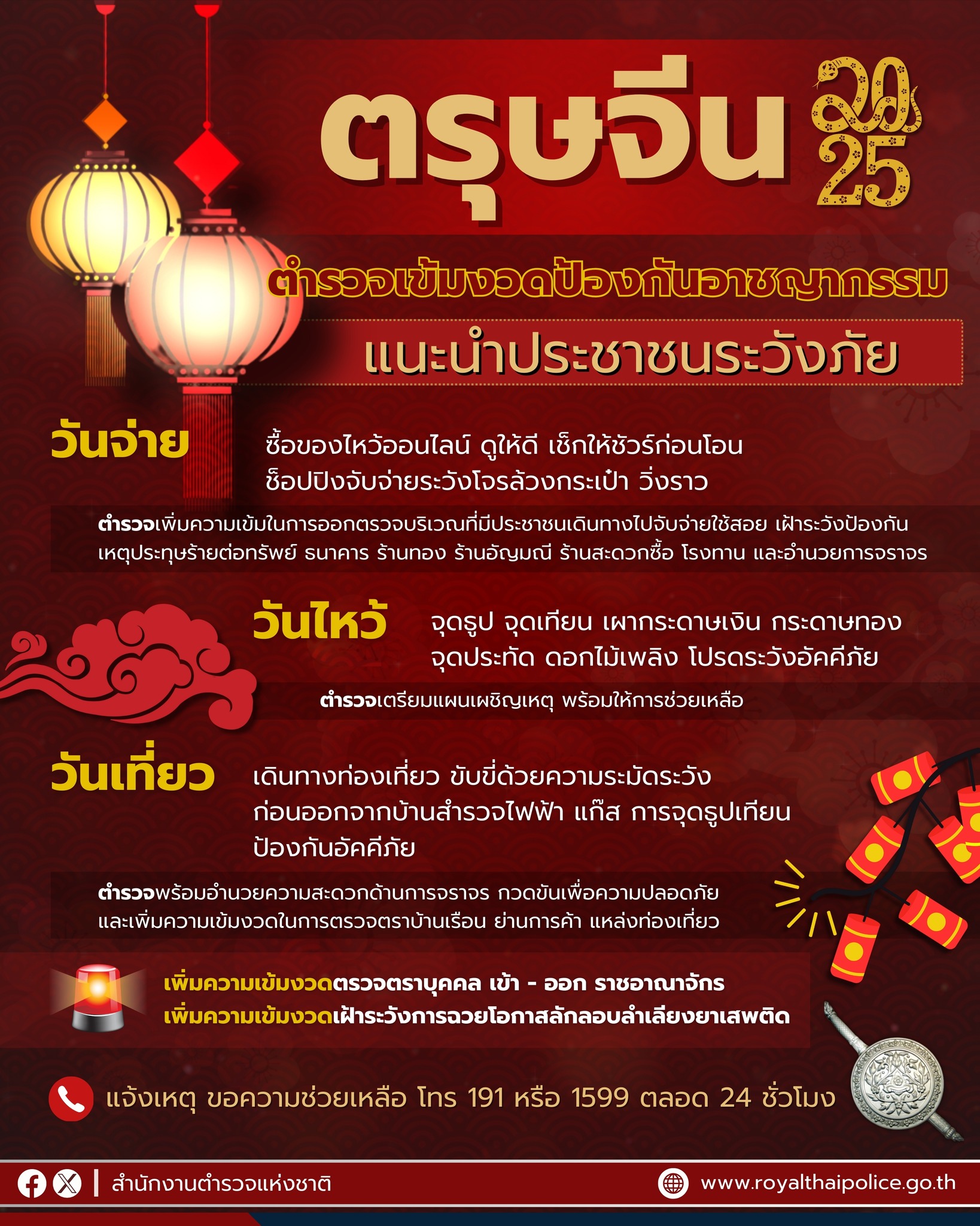 สำนักงานตำรวจแห่งชาติมีมาตรการเข้ม ดูแลประชาชนช่วงเทศกาล #ตรุษจีน 2568 ทั้งวันจ่าย วันไหว้ วันเที่ยว แนะระมัดระวังภัย 27 มกราคม 2568 โดย metrodiv6